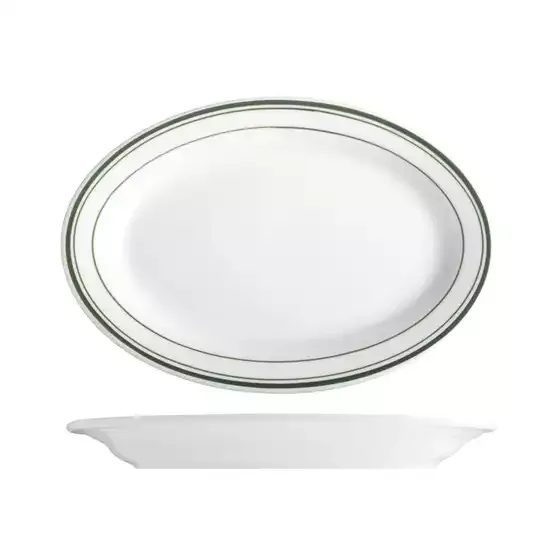 With its creamy white body and deep green banding, Green Bay is a vintage throwback with a modern approach. The double-line detail adds retro character, offering a sense of nostalgia to the dining experience. Green Bay is made from fully vitrified ceramic with enhanced chip resistance.