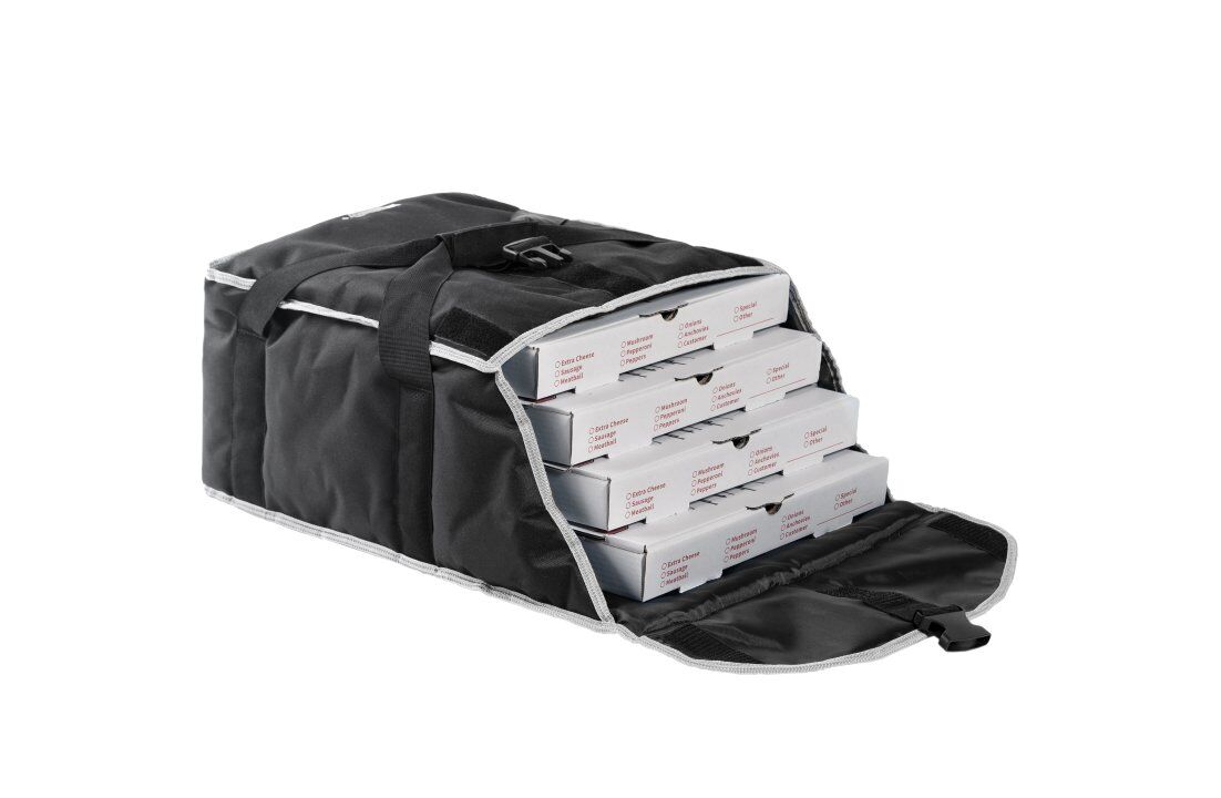 Deliver fresh, hot 18-inch pizzas in this 19" x 19" x 9" pizza delivery bag, which holds four 14- or 16-inch pizza boxes, three 18-inch pizza boxes, two 16-inch round deli trays or three half-size sheet pans with covers. Reinforced stitching provides durable performance.